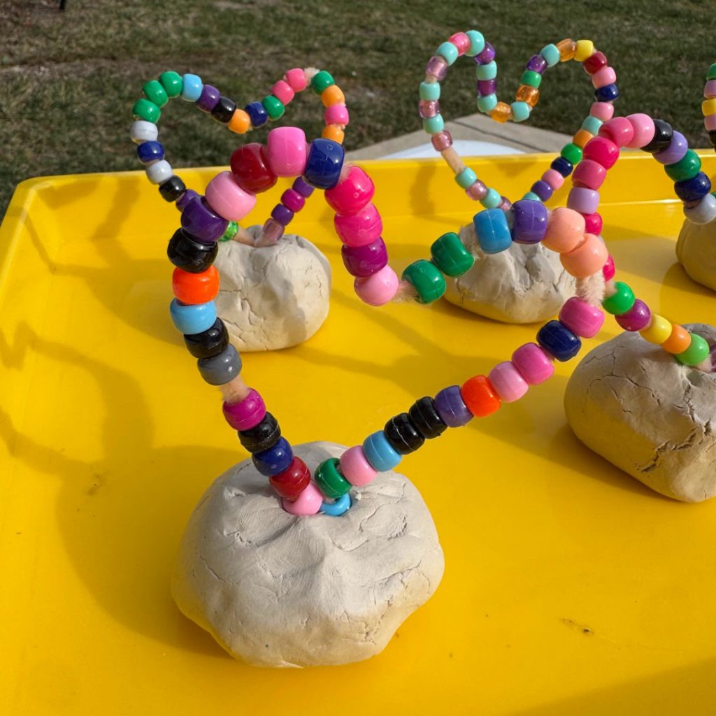 4. Finally, once kids are done filling the pipe cleaner with beads, stick the other end of the pipe cleaner into the clay and squish the clay around the pipe cleaner to secure it in place.
