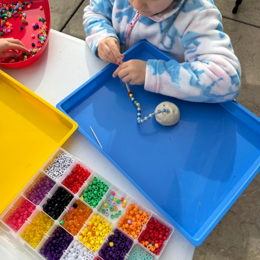 DID YOU KNOW? Threading with beads is an excellent fine motor activity for preschoolers because it builds hand strength, enhances hand-eye coordination, and develops dexterity crucial for writing, zipping, and using utensils. The precise, repetitive motion strengthens finger muscles and encourages bilateral coordination (using both hands together), fostering patience, focus, and cognitive skills like patterning and color recognition.